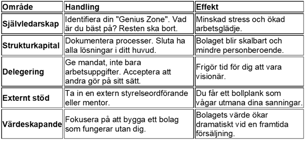 Resultatet? Du jobbar i bolaget istället för med bolaget. Potentialen stagnerar och din egen hälsa riskerar att följa med i fallet.
